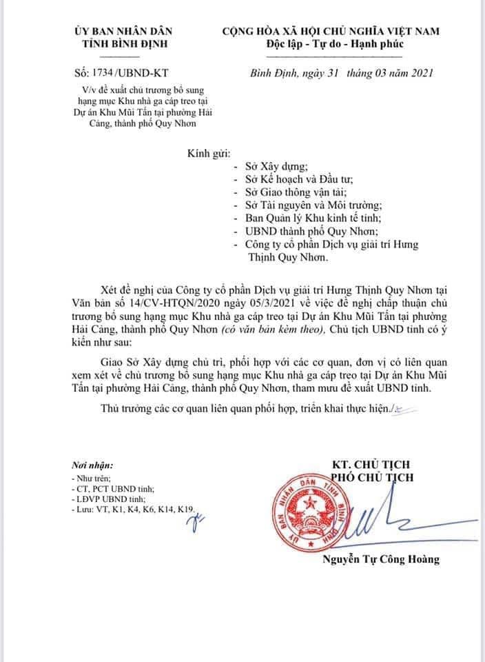 Công ty CP Dịch vụ Giải trí Hưng Thịnh Quy Nhơn (gọi tắt là Hưng Thịnh Quy Nhơn) trước đó đã có văn bản gửi UBND tỉnh Bình Định về việc đề nghị chấp thuận chủ trương thực hiện bổ sung hạng mục Khu nhà ga cáp treo tại dự án Khu lấn biển Mũi Tấn (phường Hải Cảng, TP Quy Nhơn). Liên quan đến đề xuất trên, UBND tỉnh Bình Định giao Sở Kế hoạch & Đầu tư chủ trì. phối hợp với Sở Xây dựng, các ngành liên quan và UBND TP Quy Nhơn xem xét kiến nghị của doanh nghiệp, báo cáo đề xuất UBND tỉnh trong tháng 8 năm 2020.