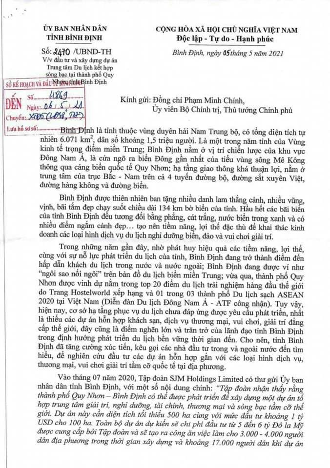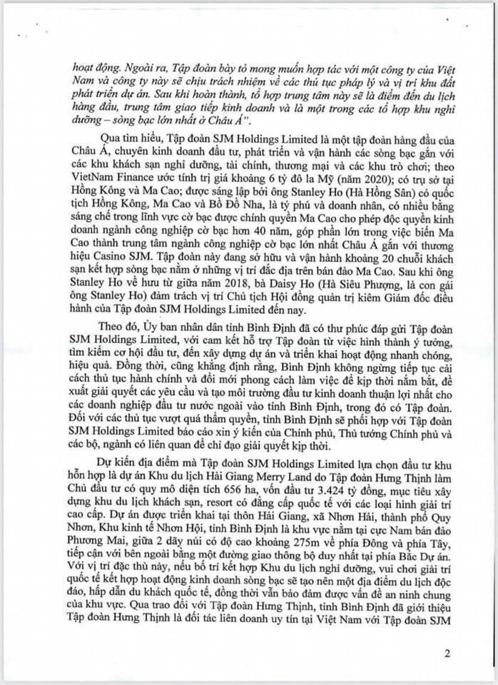 SJM – ‘ông trùm’ Casino của Macau được cho là đã gửi thư tới Chính phủ Việt Nam đề xuất đầu tư một dự án casino 6 tỷ USD ở Việt Nam. Với quy mô, vị trí dự án, nhiều nguồn tin cho rằng dự án mà Tập đoàn này muốn hợp tác là Hải Giang Merry Land Quy Nhơn do tập đoàn Hưng Thịnh làm chủ đầu tư.